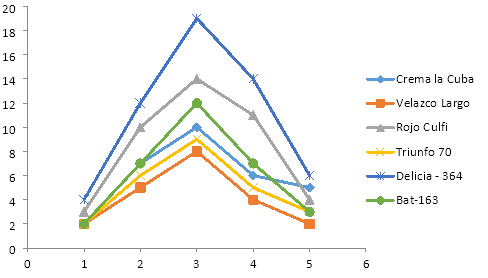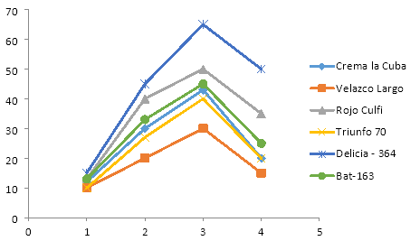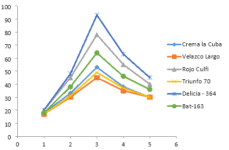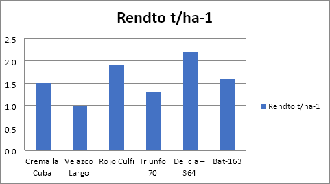 Así mismo, se obtuvo una variedad con categoría de sobresaliente con los rendimientos agrícolas 2.2 t.ha-1 que representan el 16.6 % de las variedades estudiadas. Además otro 50% obtuvo la categoría de bien con rendimientos agrícolas entre 1.5 y 1.9 t.ha-1; las dos variedades restantes tuvieron la categoría de regular, sus rendimientos no sobrepasan el 1.3 t.ha-1. La variedad Delicia-364 fue clasificada con la categoría de sobresaliente por expresar los potenciales de rendimiento agrícolas más elevados para la época tardía en la referida región edafoclimática donde se realizó el estudio.