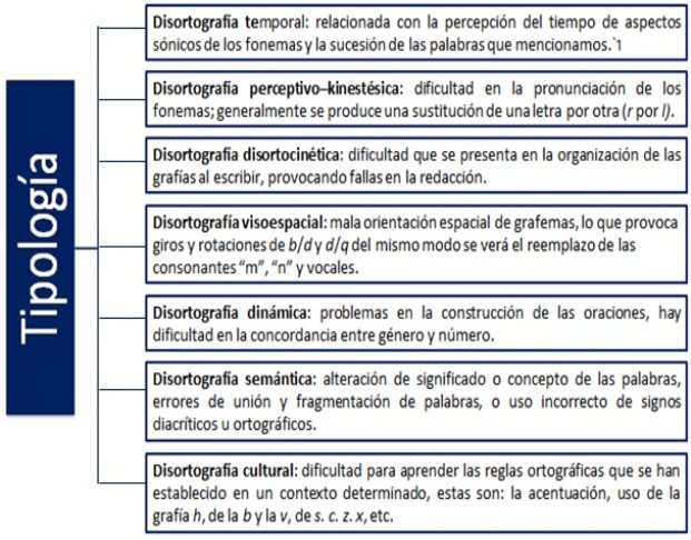 A su vez, Yucato (2024, p. 30) precisa que la disortografía “afecta al contenido y composición de la palabra, dejando al margen los aspectos de forma y trazado, implicados en el acto lector”; al tiempo, aclara que muchas veces suele confundirse la disortografía con la dislexia, que constituye una dificultad de aprendizaje consistente “en presentar un nivel lector inferior al que le corresponde por edad, relacionado a la precisión, fluidez y/o comprensión” (De La Peña & Bernabéu, 2018, p. 2).